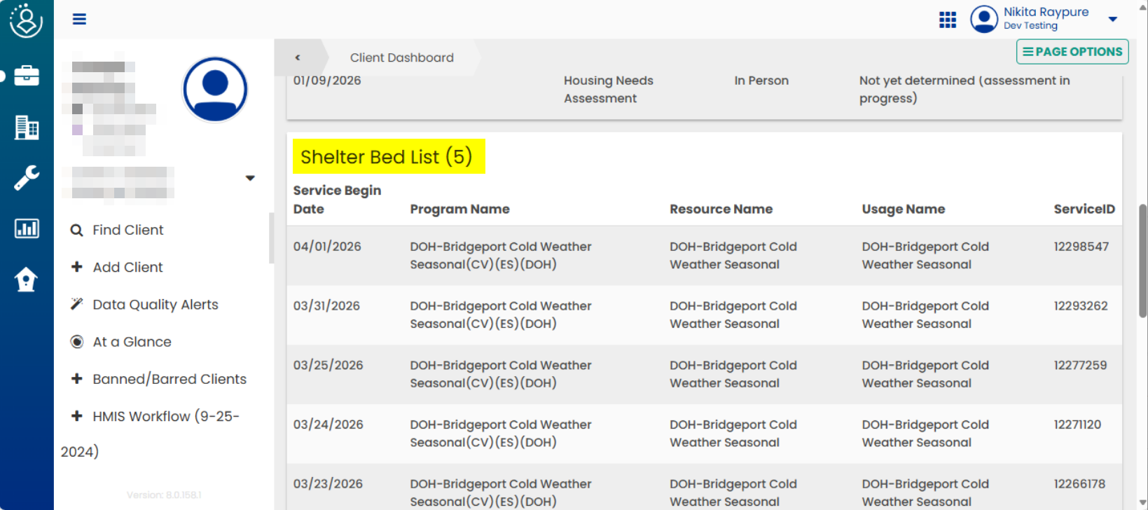 A new dashboard titled “Shelter Bed List” has been added to the Client Dashboard to resolve issues with users being unable to tell which bed list a client is currently on. The dashboard filters for service types Emergency Shelter Bed Night and Warming Center Stay. It displays the last 5 records for the client, including Begin Date, Program, Resource, Usage, and ServiceID.