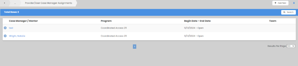Clicking on the Case Assignments hyperlink will bring users to the Provider/User Case Manager Assignments form: