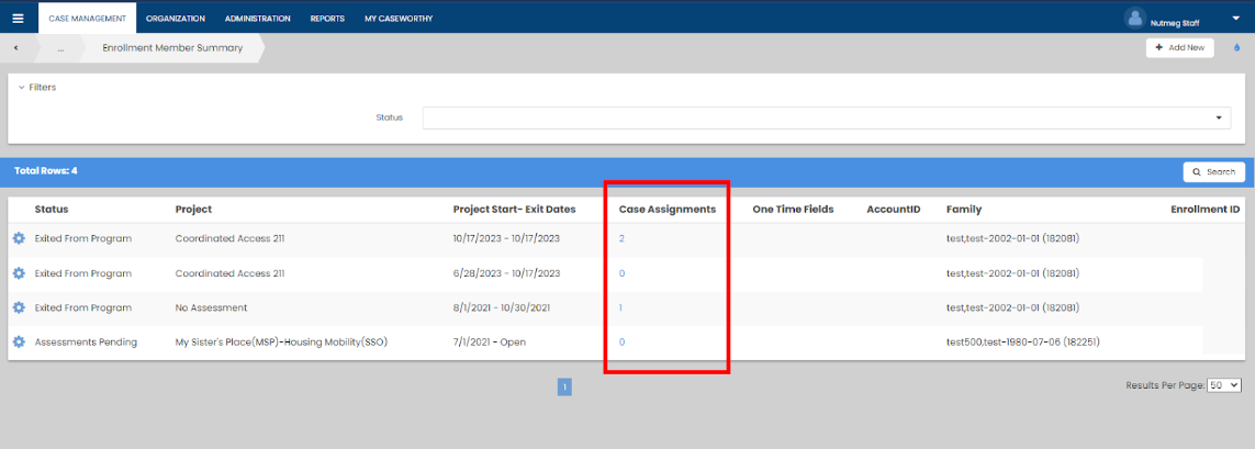 The Program Enrollment form now features a new column displaying the number of Case Managers assigned to each enrollment record, providing users with a quick overview of assignments. Each record also includes a hyperlink to the Provider/User Case Manager Assignments form, allowing users to easily view details on assigned Case Managers for each enrollment. If the record has no case managers assigned, it will display 0.