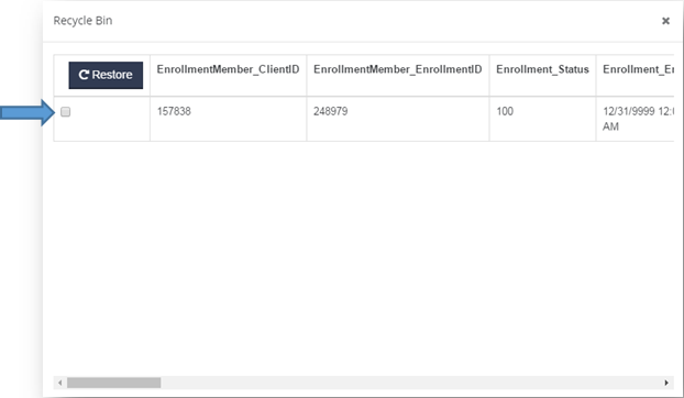 - A pop up window will appear and will list out the deleted enrollment. Click on the check box to the left of the enrollment you want to recreate and click on “Restore“