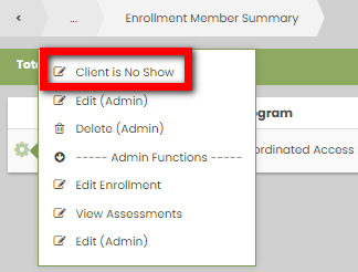 - Click the Action Gear icon next to the Coordinated Access Network program enrollment and choose “Client is No Show” (see screenshot below).