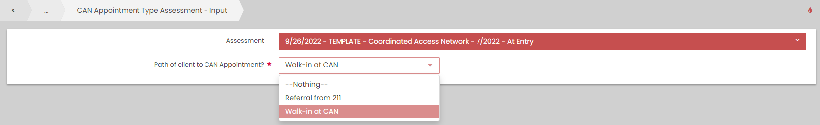 - Walk-in at CAN – Select this option for clients that walk in to a designated walk in center for a CAN Intake, that was NOT scheduled by 211. These individuals will NOT be located on a CAN Appointment Schedule until you schedule their appointment (see Step 2a: How to add a client to the Appointment Scheduler to schedule a CAN appointment.) AFTER completing the Process Referral workflow.