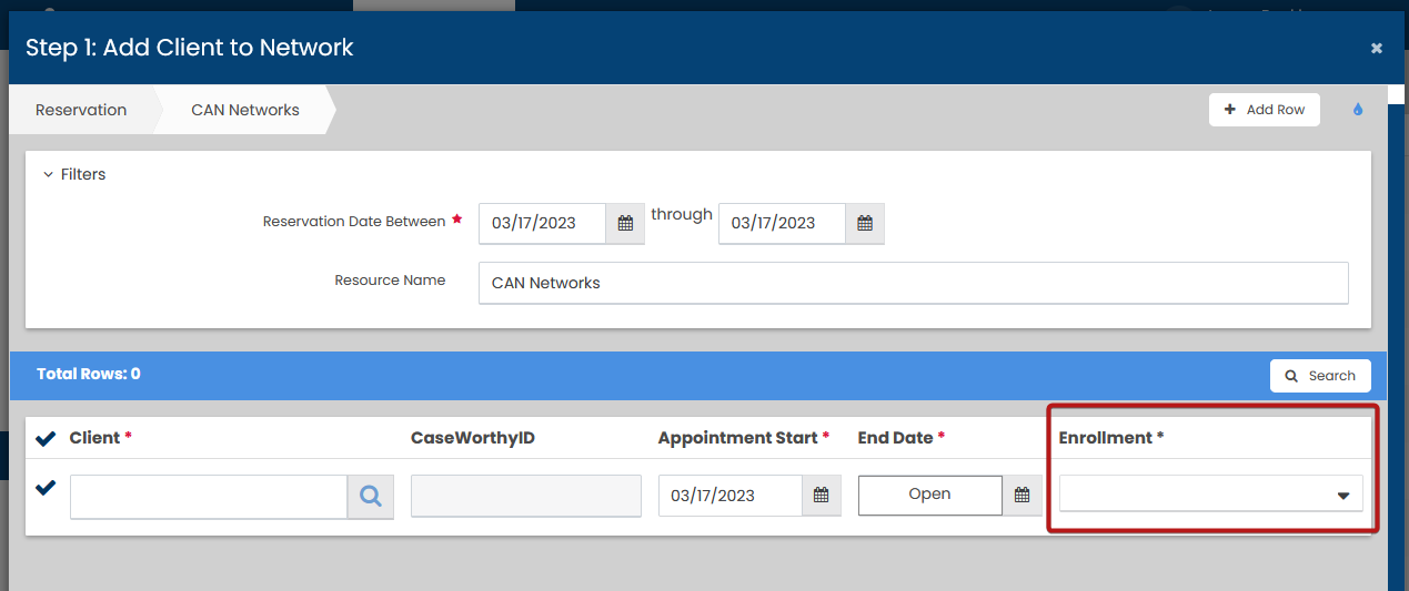 - Click “Add Row”. Your screen will add a row to allow you to search for your client.