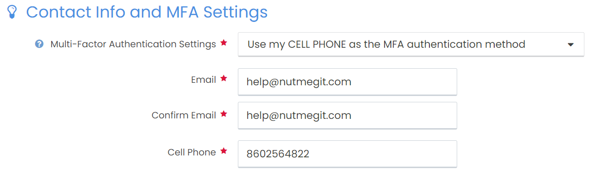 - Review the Multi-Factor Authentication Settings Contact Information for your user account.