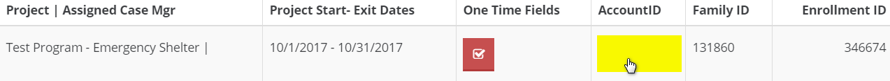 - Click “Save” to return to the program enrollment form. The “AccountID” field on the HMIS Enrollment Member Summary form will be populated.