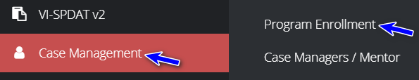- In the left-side menu click on “Case Management”, in the sub-menu that appears click on “Program Enrollment”.