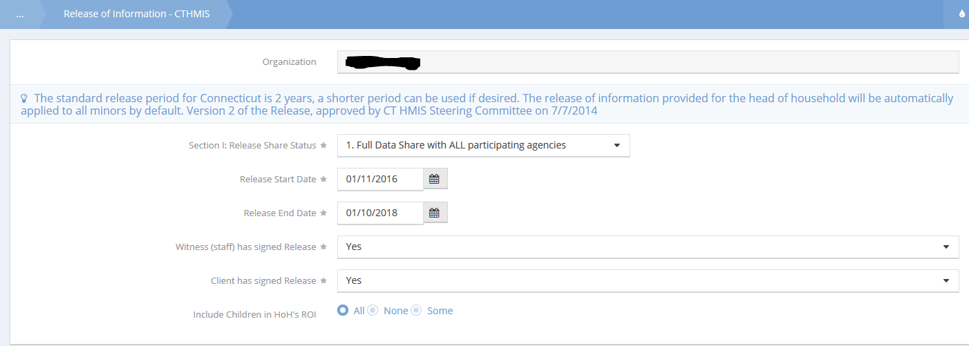 - On the Release of Information – CTHMIS page, choose a Full Data Share with ALL Participating agencies and the other required fields will show (ex. Dates). Choosing Client Refused to Sign Release will hide the Save button and you will not be allowed to enter an ROI or data for that client.