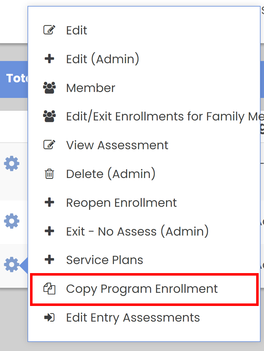 On the action gear, you will see an item, “Copy Program Enrollment” Selecting this will open the Copy Program Enrollment popup form that contains the two fields you need inorder to copy the enrollment. It will copy information from the enrollment you selected the action gear from. |