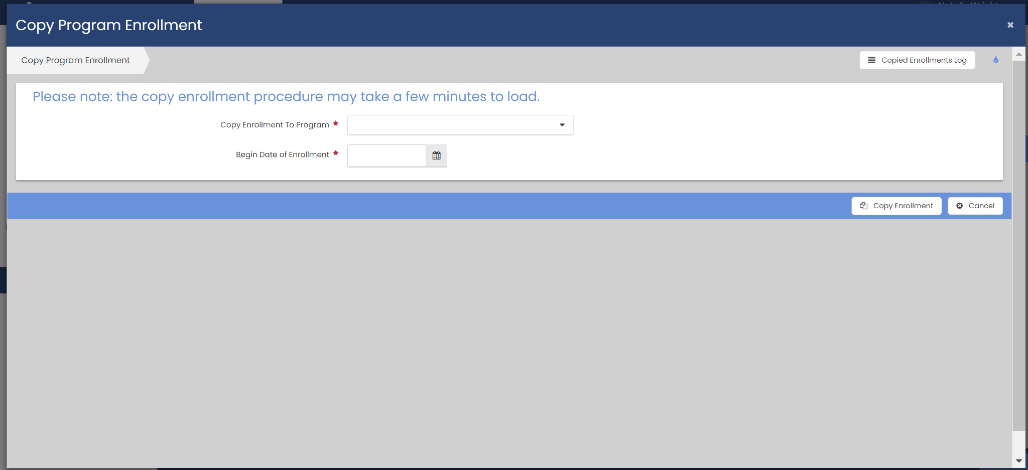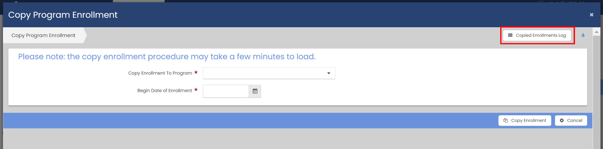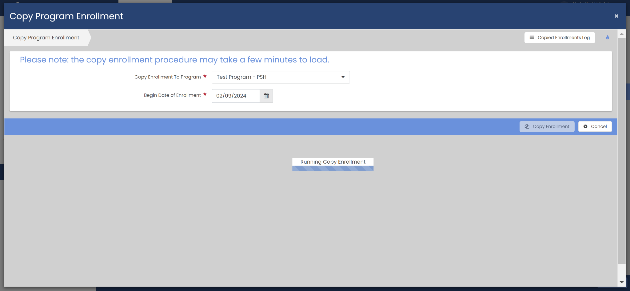 In the Copy Enrollment To Program dropdown you can select the program that you want the enrollment to be copied to. In the Begin Date of Enrollment field you can set your desired begin date of the enrollment. Clicking the Copy Enrollment button will begin the process of copying the enrollment to the program selected from the drop down with the set enrollment begin date. There will be a box shown on the screen stating “Running Copy Enrollment ” with a loading bar, once the enrollment is finished being copied this popup will close.
