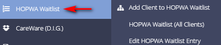 This will allow the “HOPWA Waitlist” option to be visible. The below items will available in the sub-menu: