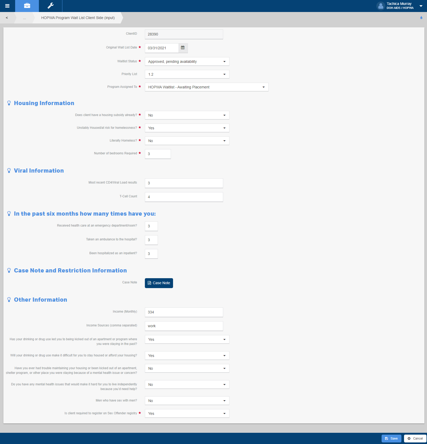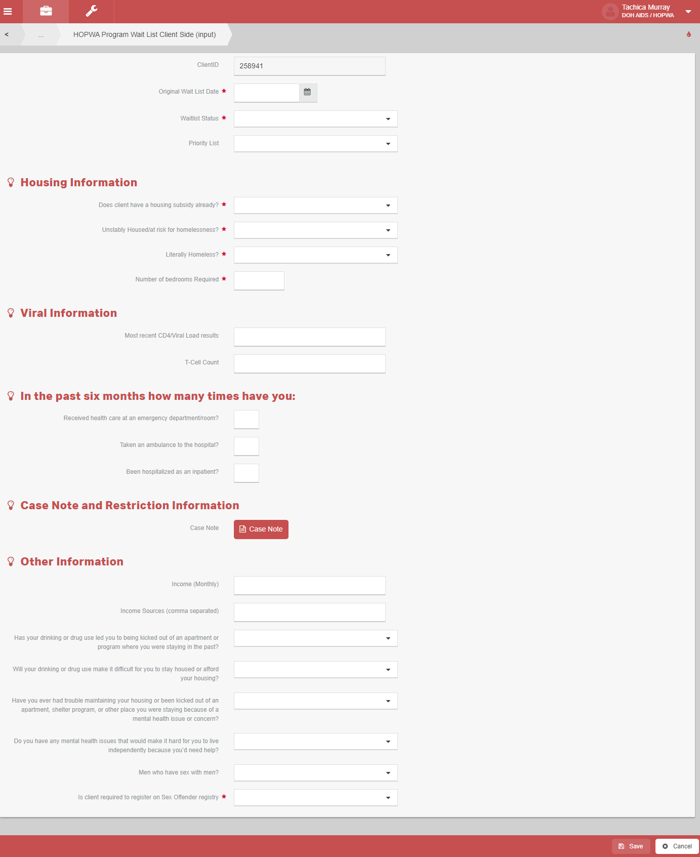 8. The “HOPWA Program Wait List Client Side (Input)” form will load.